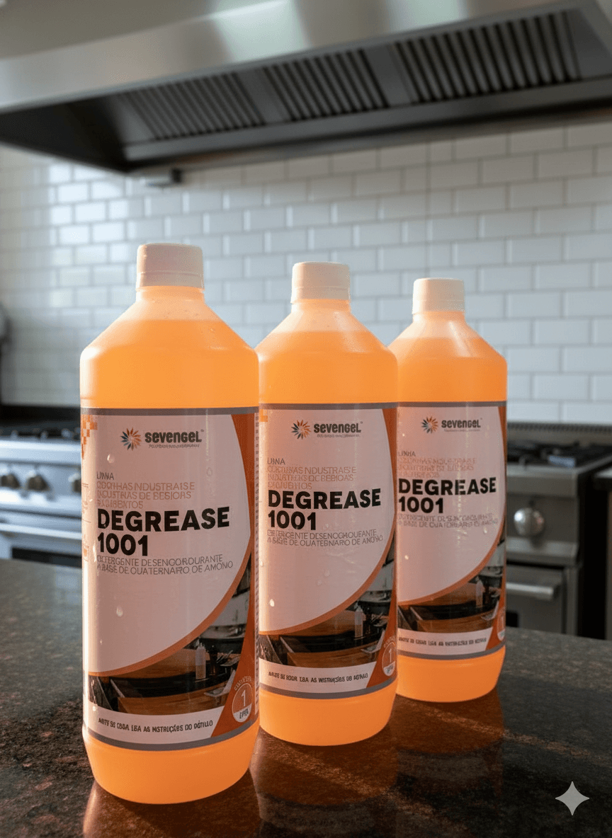 DEGREASE 1001 é um detergente desengordurante concentrado biodegradável com quaternário de amônia. Limpa e higieniza em uma única operação. É indicado para limpeza de superfícies que contenham gorduras ou óleos, tanto de origem animal como vegetal, proteínas e outros resíduos de origem orgânica. Ideal para ser usados em cozinhas industriais, equipamentos de indústrias alimentícias, laticínios e frigoríficos. Pode ser usado também na limpeza geral de pisos, azulejos, coifas, paredes, utensílios, câmaras frigoríficas e pet shops.